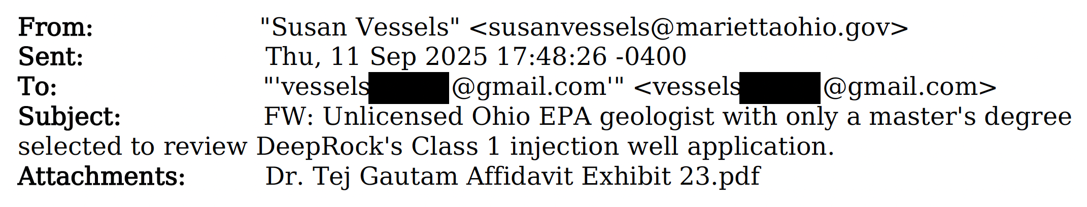 In the midst of heated debate over the proposed injection-well project near Marietta, a set of recently obtained public records offers a revealing window into the tone and tactics of Susan Vessels, President of Council in Marietta. These emails and communications show a pattern of meddling, confrontational language, and controlling. Because these records are part of the public record, they belong in the public conversation: they are not anonymous rumors or second-hand gossip. Instead, they reflect the conduct of Susan Vessels with direct implications for public trust. It’s time for Susan Vessels to be held accountable.