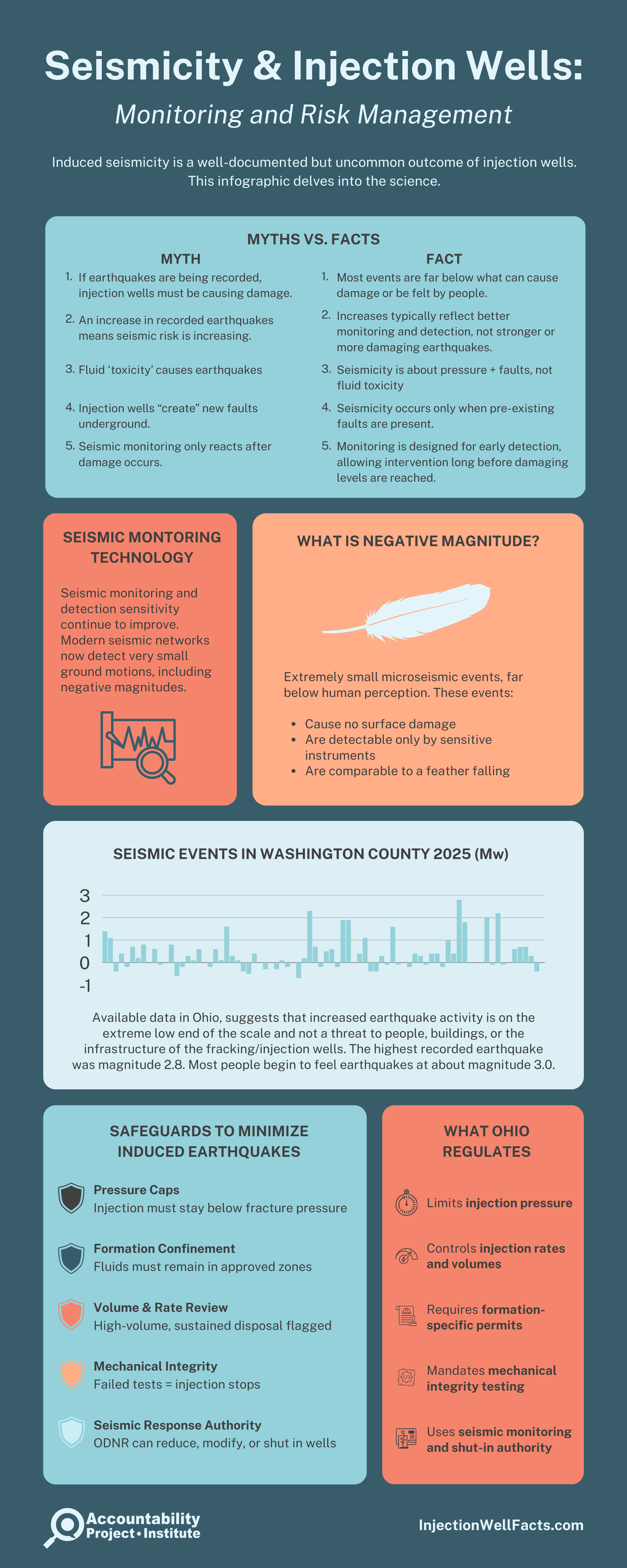 There is often a concern about seismic activity around injection wells. Out of 232 active oil brine wells in Ohio, Peer-reviewed research and the ODNR have found very few tied to any sort of suspected seismic activity.